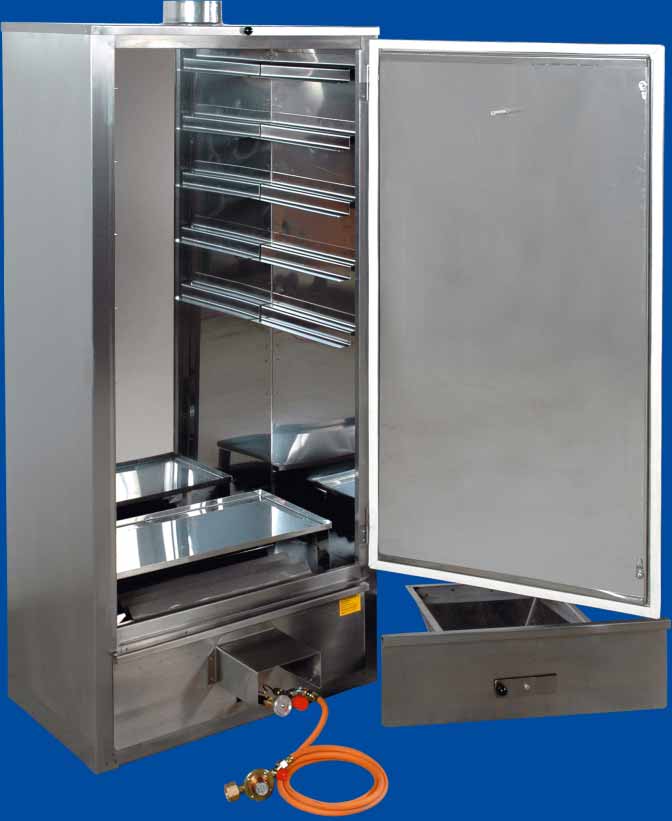 Afumatoarea F 2 70 este confectionata din inox cu pereti dublii, izolati cu vata minerala. Ideala pentru intreprinderi mici si mijlocii. Capacitatea de afumare este de aprovimatix 45 – 60 de pesti dispusi pe 4 randuri sau 30 – 40 Kg. carne. Pestii pot fi agatati pe carlige in 4 straturi sau se pot pune pe 4 gratare.